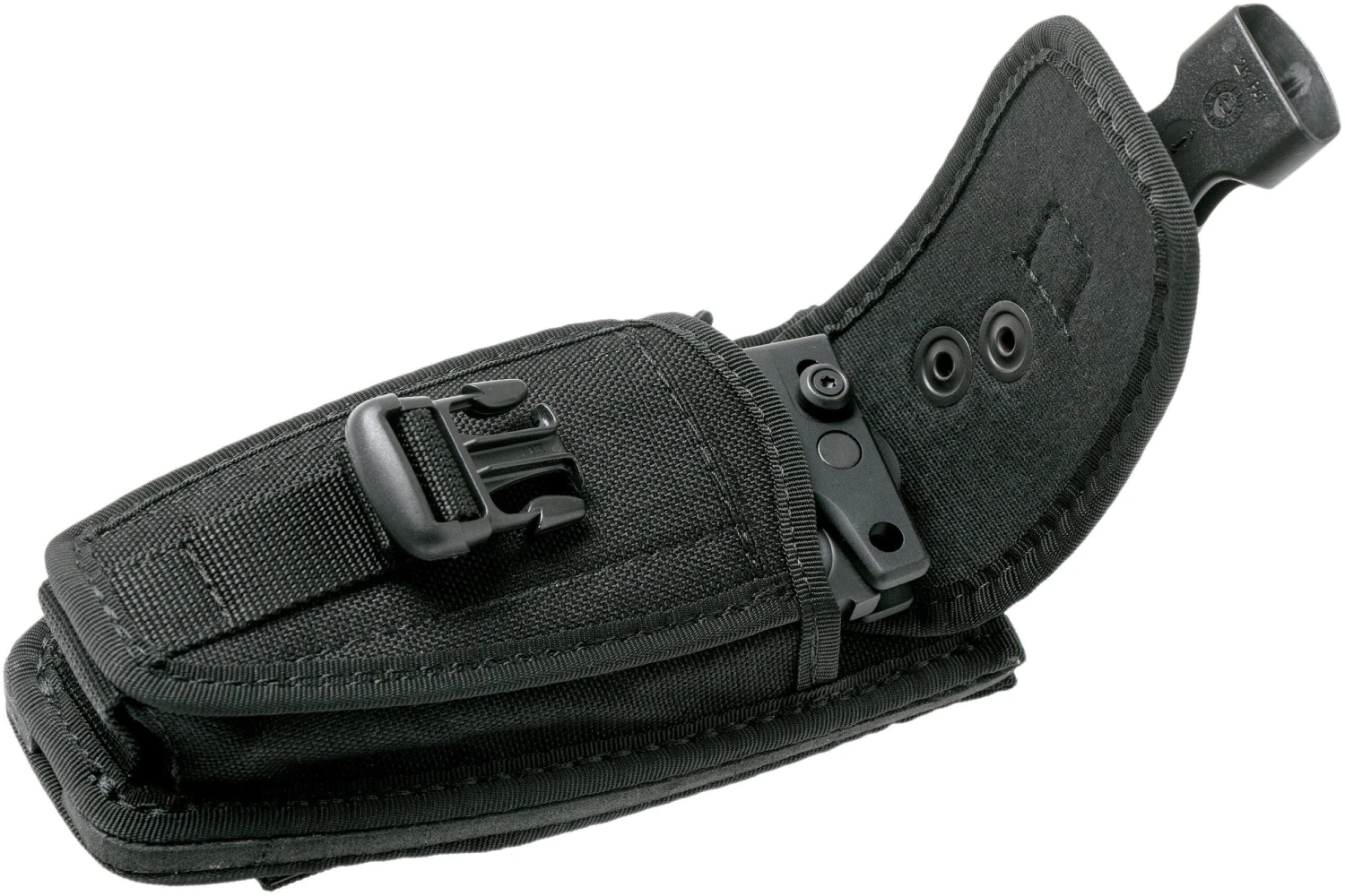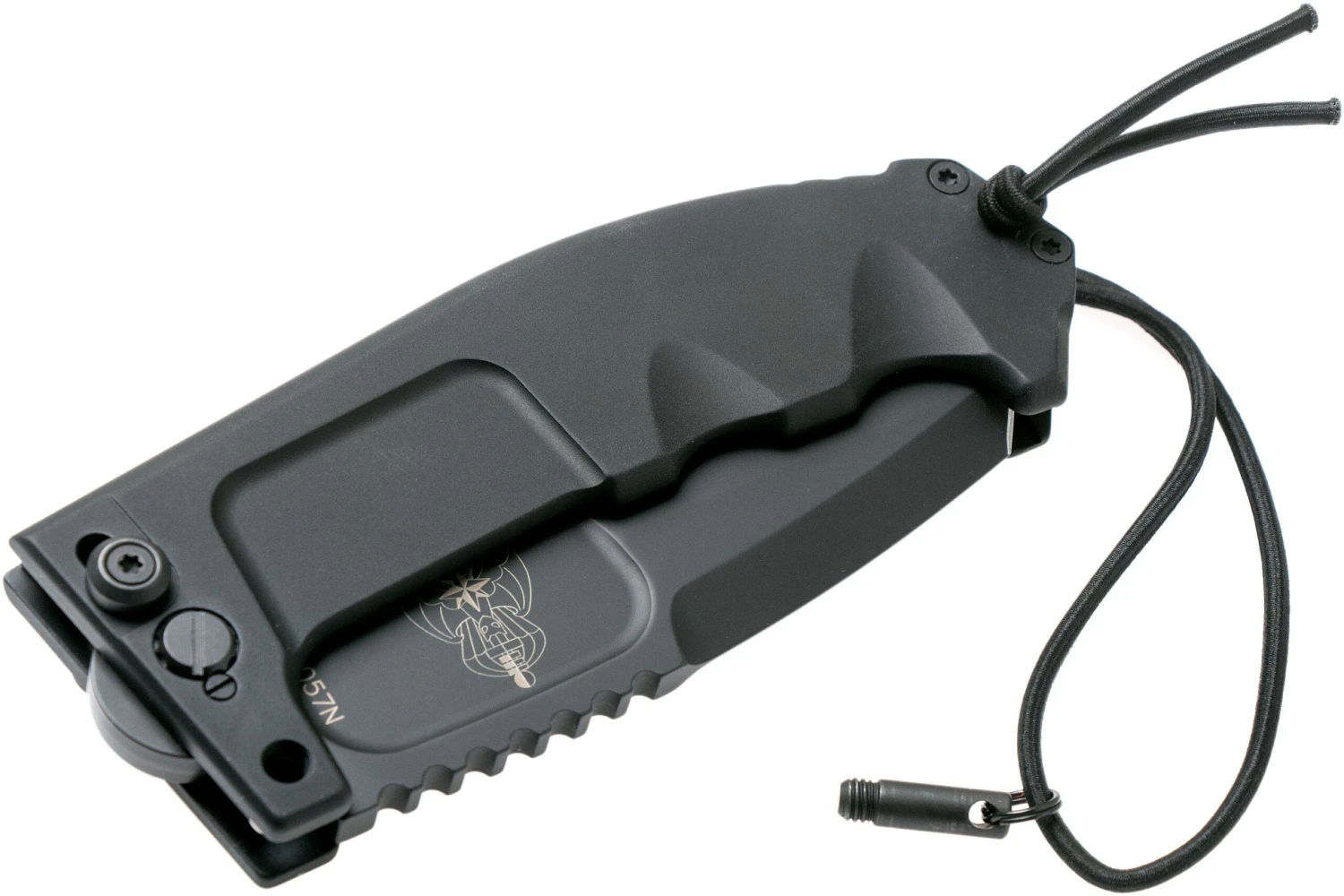 La apertura y el cierre de la hoja se realizan con las dos manos juntas para minimizar el riesgo de autolesiones. El mecanismo de seguridad adicional es un perno de acero que se atornilla a mano a través de dos orificios situados en la zona de protección del mango macizo de aleación de aluminio anticorodal. Este mecanismo es necesario debido a la actuación violenta de corte que presenta esta navaja poco común. La funda es una parte indispensable del conjunto. Contiene un afilador de diamante y permite al usuario llevar la navaja en forma desplegada (sujeta por un encaje de dos clips) o en forma plegada (dentro del bolsillo delantero). La funda se puede colgar en una chaqueta de combate o a los cinturones estándar gracias al M.O.L.L.E. sistema militar.