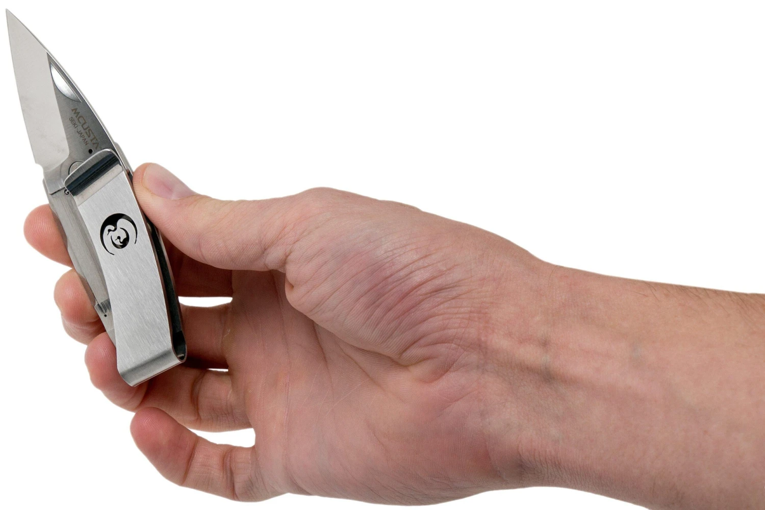 El Mcusta MC-0083 Pocket Clip Kamon Crane es un interesante cuchillo de caballero. Es único dentro de la gama Mcusta. Los cuchillos de la serie Pocket Clip Kamon tienen un mango hecho de una sola pieza de acero, que se ha doblado para crear un clip de bolsillo. Esto te permite llevar fácilmente el cuchillo en el bolsillo o atado a tu corbata como un pasador de corbata. ¡Muy elegante! La hoja de acero AUS-8A se abre con el nail nick y, a continuación, un cierre linerlock, integrado en el mango, mantiene la hoja en su lugar.
